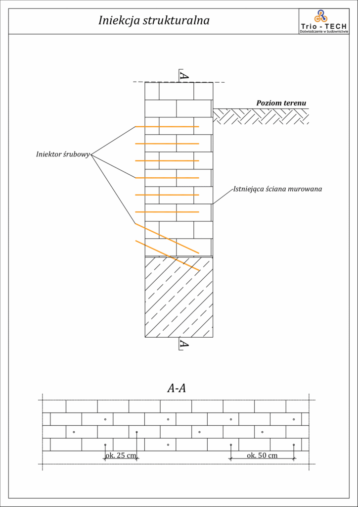 Oferujemy również uszczelnienie fundamentów czy piwnic murowanych za pomocą jednej z najlepszych metod, czyli iniekcji strukturalnej. Jest to standardowa metoda odtworzenia izolacji pionowej, która ma szczególne zastosowanie w przypadku ścian fundamentowych, do których dostęp możliwy jest jedynie od wewnątrz (brak możliwości odkopania fundamentów). Metoda ta polega na wysyceniu struktury muru (fug i materiałów nasiąkliwych) żywicą poliuretanową zapobiegającą nasiąkaniu fundamentów oraz podciąganiu kapilarnemu, a poprzez wysycenie elementu murowanego powodując jego uszczelnienie i wzmocnienie. Pierwszym etapem iniekcji strukturalnej analogicznie jak w przypadku iniekcji wysokociśnieniowej jest wywiercenie otworów o średnicy Ø10 prostopadle do ściany murowanej w rozstawie ok. 30 cm z przesunięciem w rzędach o połowę odległości między otworami. Następnie montaż iniektorów śrubowych oraz wtłoczenie elastycznej żywicy poliuretanowej do momentu pojawienia się jej na powierzchni uszczelnianego elementu. Kolejnym etapem jest demontaż iniektorów śrubowych oraz uzupełnienie i wyrównanie powstałych otworów. Wtłoczona żywica wnika w strukturę muru i wypełnia wszelkie pory, rysy i nieszczelności. Możliwe jest również wykonanie tzw. przepony zapobiegającej podciąganiu kapilarnemu za pomocą iniekcji przeponowej, czyli wykonaniu iniekcji tylko w najniższym rzędzie cegieł. Ten wariant stosuje się w przypadku możliwości odkopania fundamentów i zastosowaniu izolacji pionowej ścian fundamentowych w postaci zapraw hydroizolacyjnych.