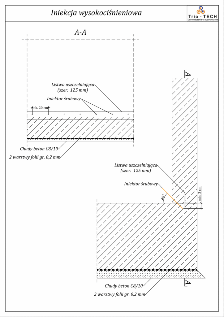 W przypadku konieczności uszczelnienia powstałych zarysowań płyty i ścian fundamentowych firma Trio-Tech Sp. z o.o. odpowiada za wykonanie uszczelnień iniekcyjnych rys. Pierwszym etapem naprawy jest lokalizacja miejsca powstałego przecieku. Iniekcja ciśnieniowa polega na wywierceniu otworów o średnicy Ø10 pod kątem 45° do powstałych zarysowań, zamontowaniu iniektorów śrubowych, a następnie wtłoczeniu żywicy poliuretanowej do momentu pojawienia się jej na powierzchni uszczelnianego elementu. Otwory nawiercane są do głębokości ok. 2/3 grubości danego elementu, jednakże trzeba mieć na uwadze możliwość wystąpienia kolizji wykonanych otworów ze zbrojeniem elementu. Do wykonania uszczelnień iniekcyjnych stosowane są tłokowe pompy iniekcyjne. W zależności od rodzaju iniekowanego elementu dobiera się rozstaw oraz rozmieszczenie iniektorów (naprzemiennie po obu stronach powstałej rysy lub jednostronnie).